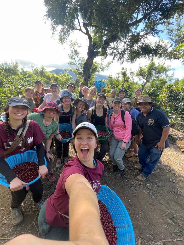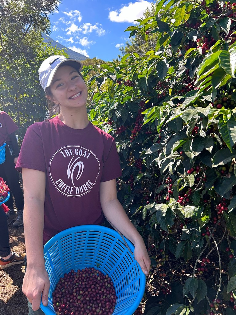 Aprendí esto, en solo 2 horas…. 20 personas coleccionamos 55 libras de la fruta. Pero, después de las próximas etapas en el proceso del café, solo coleccionamos 9 libras de café para beber…. Este hecho me sorprende… los compañeros necesitan hacer mucho trabajo para que podamos beber una taza de café. También, lo es un trabajo sucio! Había tanta suciedad debajo de mis uñas! También, cada día, los compañeros caminan los volcanes donde las plantaciones están! Es un camino brutal!