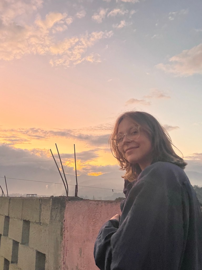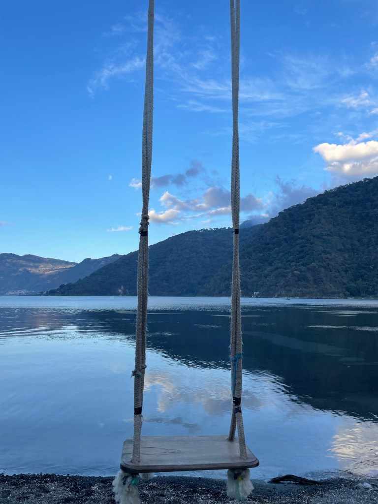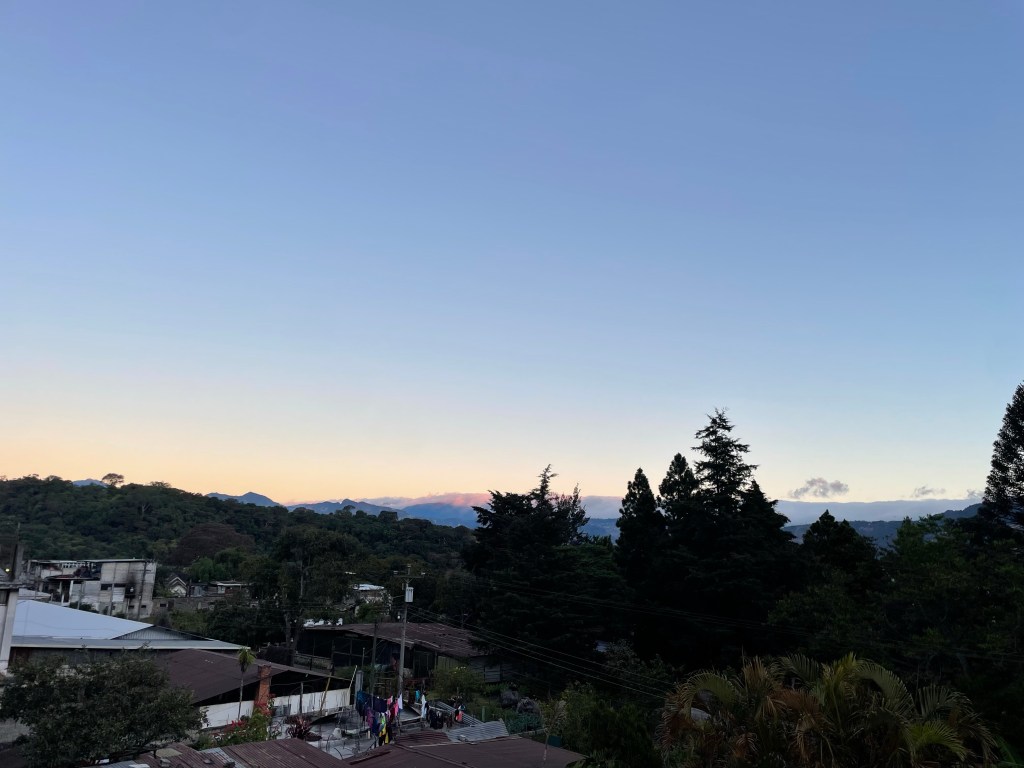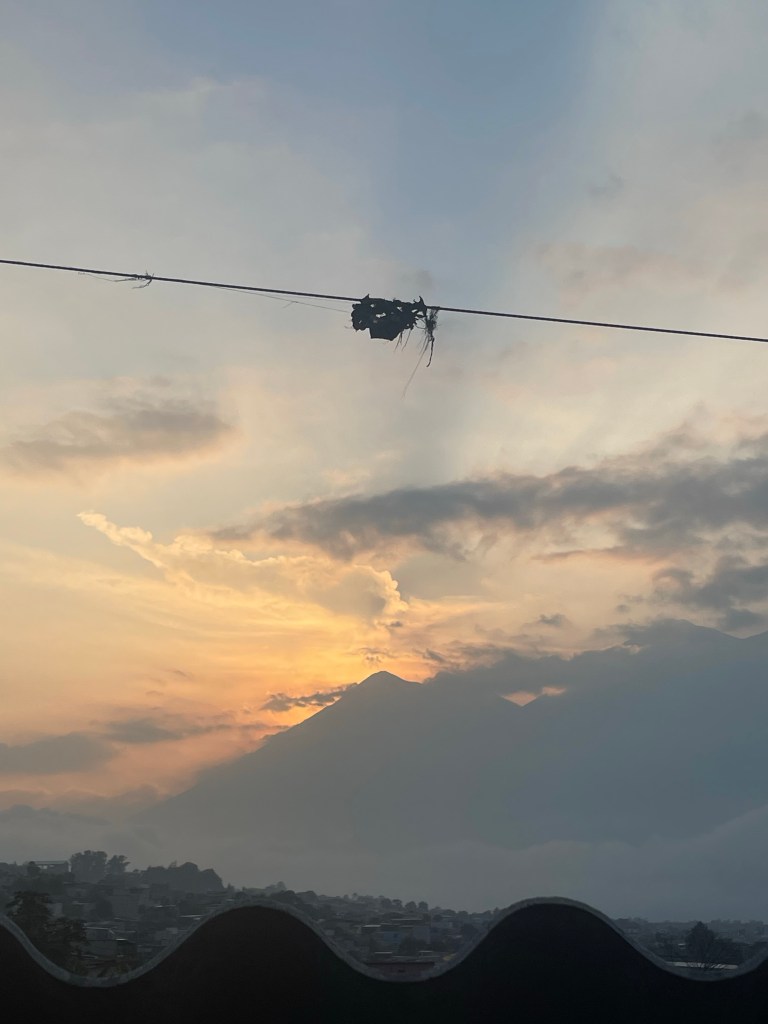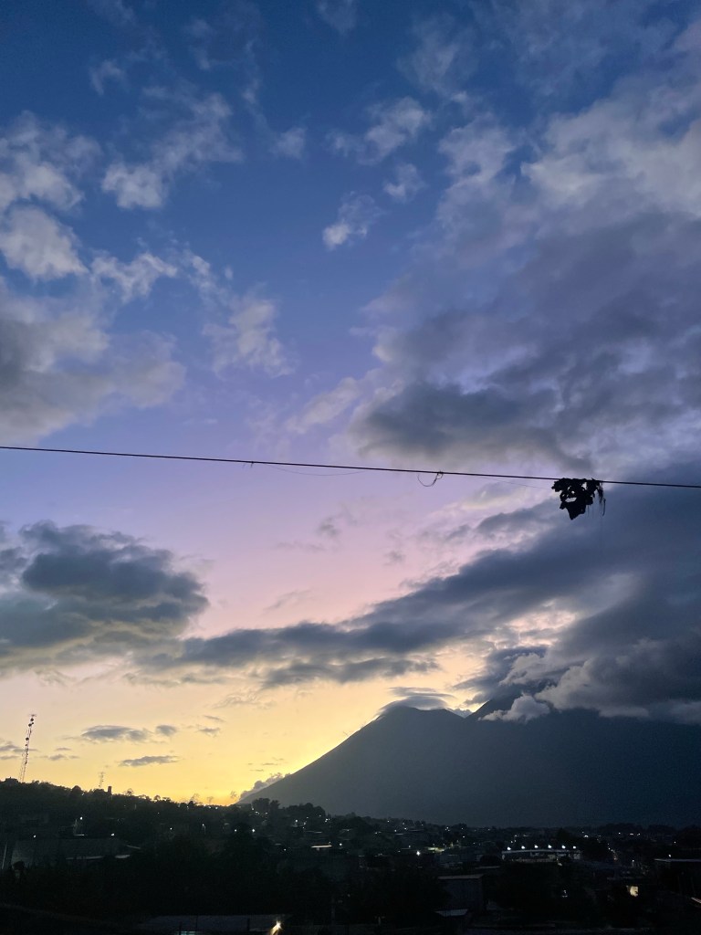Aprendiendo a estar quieto. Los sonidos de la naturaleza despiertan mientras los humanos están durmiendo. Los nublados son rosados por el sol. El cielo está cambiando por el segundo: su colores son preciosos. Nunca he visto vegetación como esa que se encuentra en los volcanes de San Lucas Tolimán, y por todo Guatemala. El sol brilla ligeramente y se refleja en la punta del volcán. Estoy escuchando la canción “Vida La Vida” de Coldplay. Ahora, todo en mi vida es perfecto.