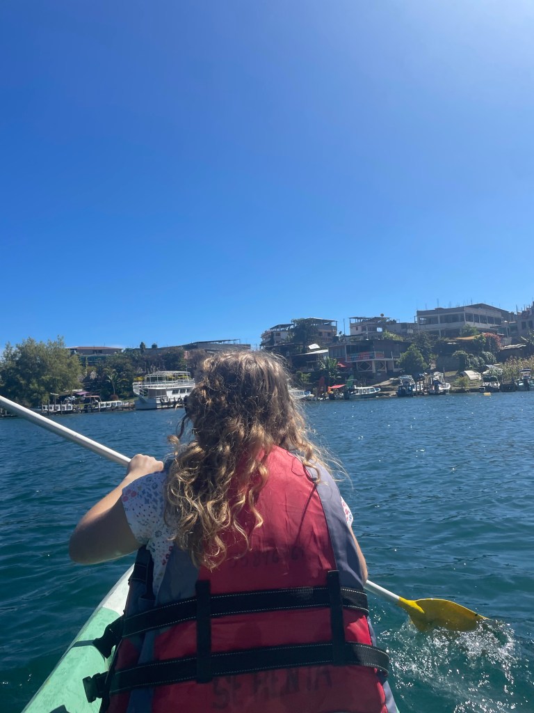 El día final en San Lucas Tolimán, fuimos a otra ciudad al otro lado del lago. Pasé el día con una de mis nueva amigas. Caminamos por la ciudad, bebimos un café, e incluso hicimos kayak al otro lado del lago! Estábamos sentadas allí, en nuestra kayak, mirando a los volcanes, y las numerosas ciudades, y solo hablamos.